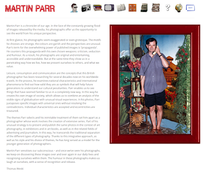 For my first entry into this blog i wanted to start on doing research towards building a photography website for myself. For this i wanted to draw inspiration from other websites, starting with other photography websites such as Martin Parr's own website, a website i was shown as an example. What stuck out to me about Parr's website design was that it stuck partially to his style of photography, as the website itself is fairly simplistic with basic page layout, white background and a simplistic style of font. this itself doesn't seem like his style, being quite corporate, but other aspects do, like how the page selector icons are all different identifying photos such as the intro page being a portrait of parr, on top of the bright red paint like logo in the top left, the quirkiness and bright colours paying homage to the quirkiness and bright colours of parrs own photographic work.